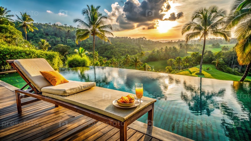 Спокойный взгляд на закат солнца с бассейнового кресла