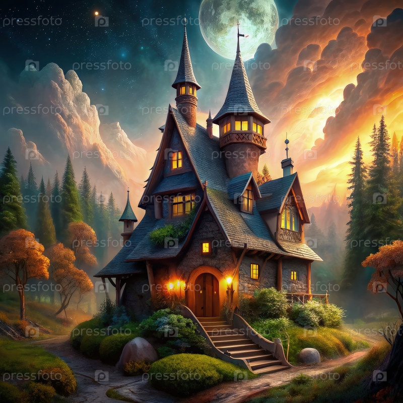 Дом каменного волшебника под полнолунием в лесу