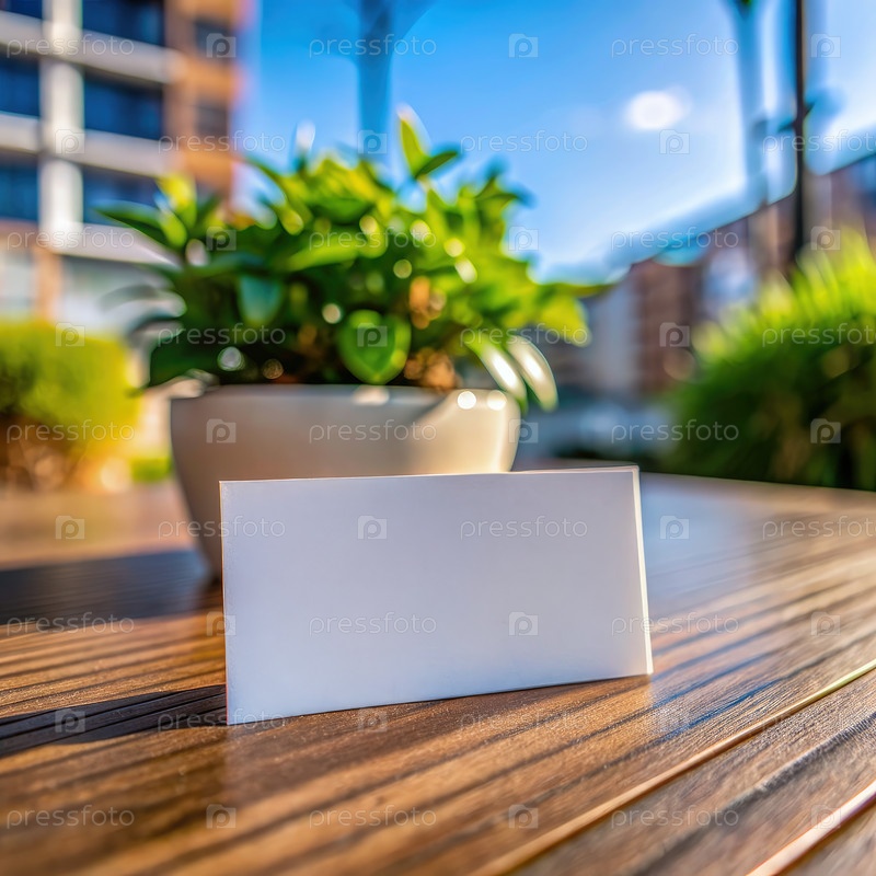 Пустая белая карточка на деревянном столе с зелеными растениями и солнечным видом