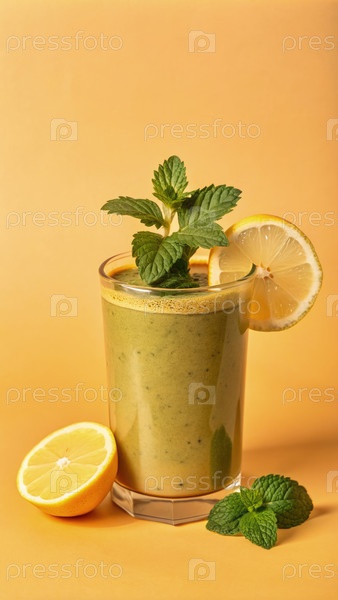 Зеленый смузи с лимонным бальзамом и кусочкой лимона на желтом фоне