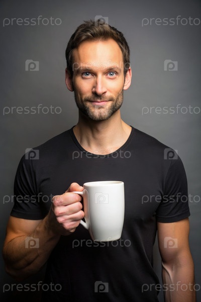 Мужчина в черной футболке держит большую белую кружку на сером фоне