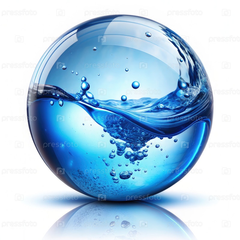 Сфера, заполненная голубой водой и пузырями на белом фоне