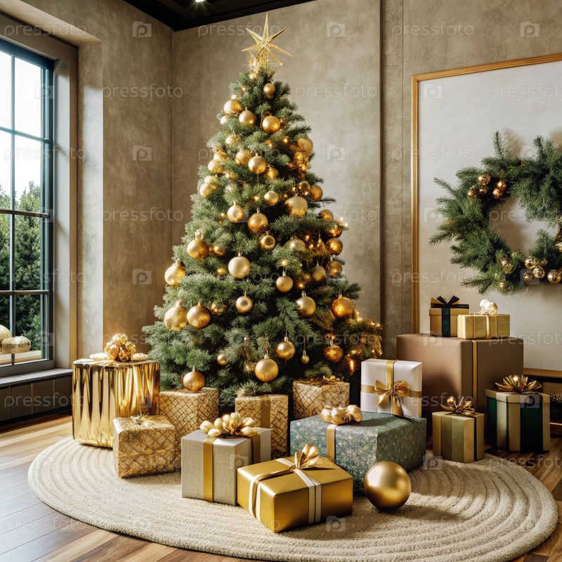 Рождественская елка, украшенная золотыми орнаментами и подарками в шикарном доме