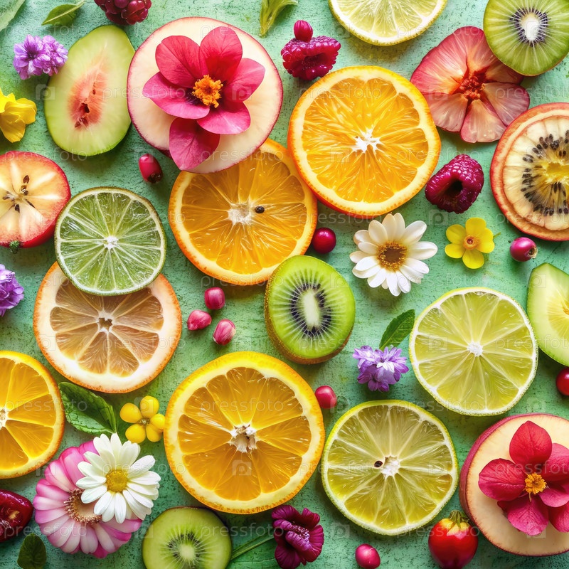 Вибрирующие кусочки фруктов и цветов, расположенные на зеленой поверхности