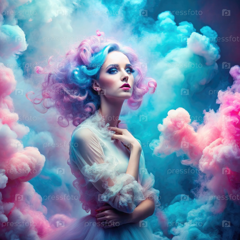 Женщина с розовыми и синими волосами, позирующая в красочном дыме