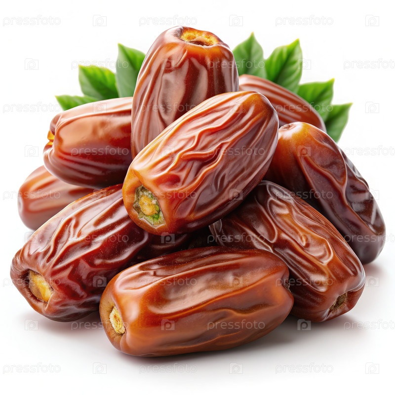 Куча свежих, созревших дат с зелеными листьями на белом фоне
