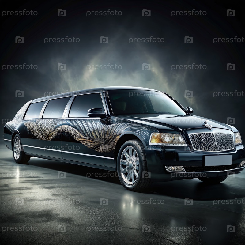 Черный лимузин с украшенным дизайном припаркован на темном фоне
