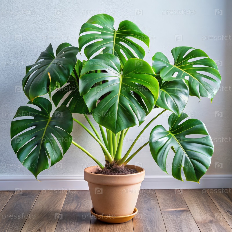 Monstera Deliciosa - растение в терракотовом горшке на деревянном полу