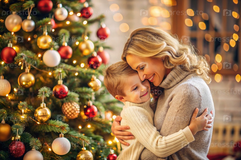 Мать и сын обнимаются украшенной рождественской елкой