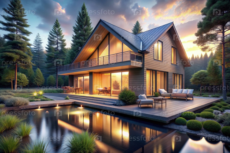 Деревянный дом с прудом и палубой на закате в лесной обстановке