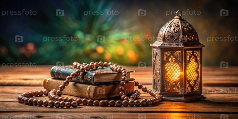 Празднование Рамадана Карим с украшенным фонарем и молитвенными бусинами