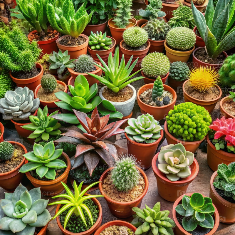 Разнообразная коллекция суккулентов и кактусов в терракотовых горшках