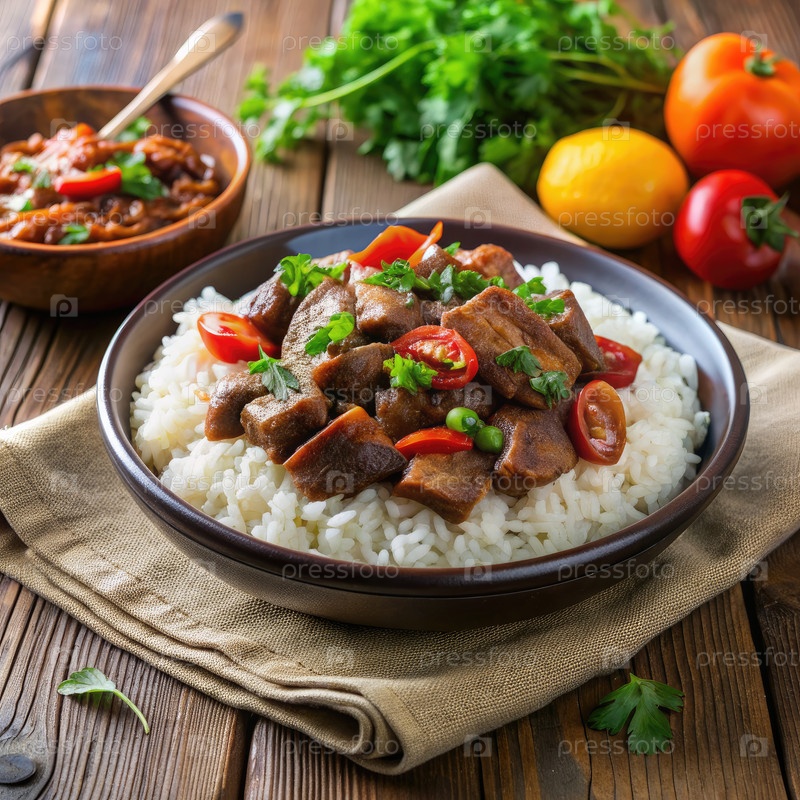 Домашнее блюдо из говядины и риса с вишневыми томатами и петрушным гарниром
