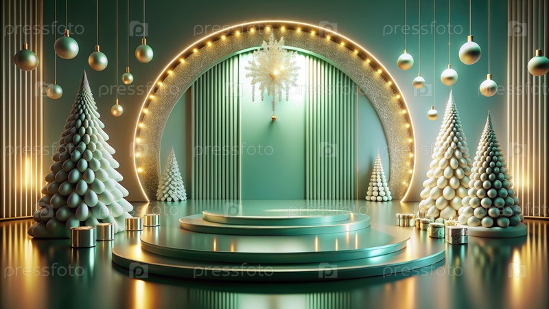 Минималистская зеленая новогодняя сцена с блестящей аркой и рождественскими деревьями