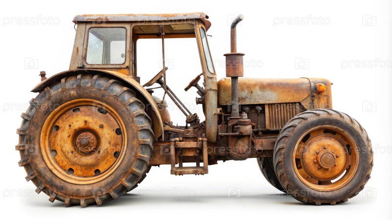 Ржавый винтажный трактор, изолированный на белом фоне