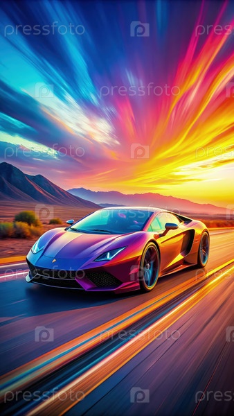 Красочный спортивный автомобиль едет по пустынному пейзажу на закате