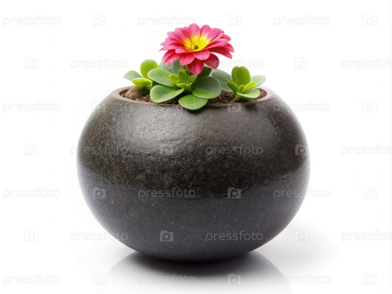 Одинокий розовый цветок в форме каменного шара, черный цветочный горшок на белом фоне
