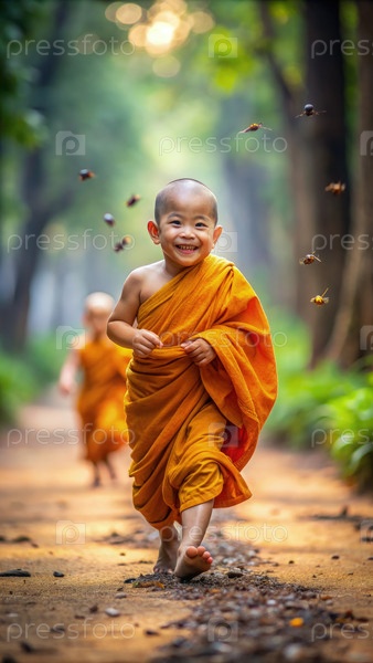 Веселый молодой монах, бегущий по лесной тропе