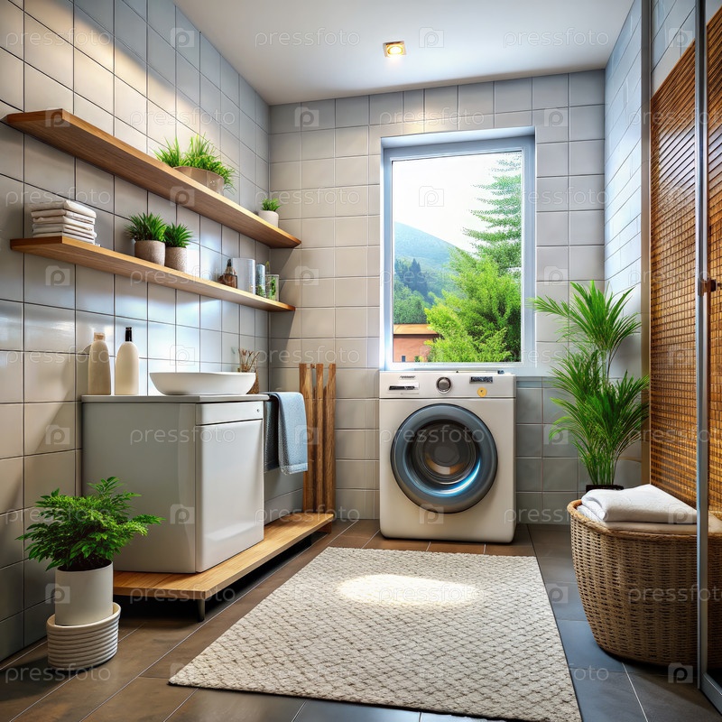 Ванная комната с стиральной машиной, растениями и видом на окно