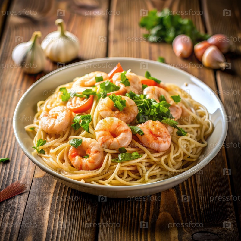 Ближайшее изображение креветок и макаронного спагетти на белой тарелке