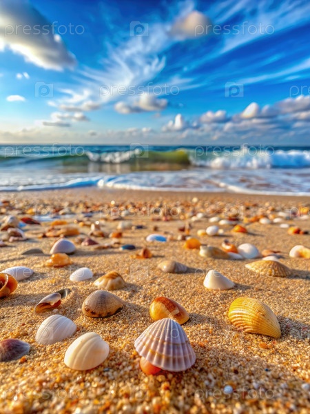 Кораллы разбросаны по песчаному пляжу с голубым небом и волнами