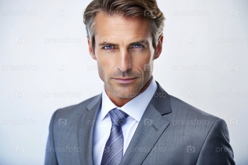 Уверенный бизнесмен в сером костюме позирует на белом фоне