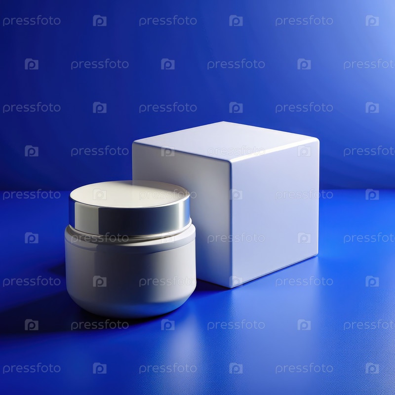 Минималистская упаковка бутылки с кремом на синем фоне