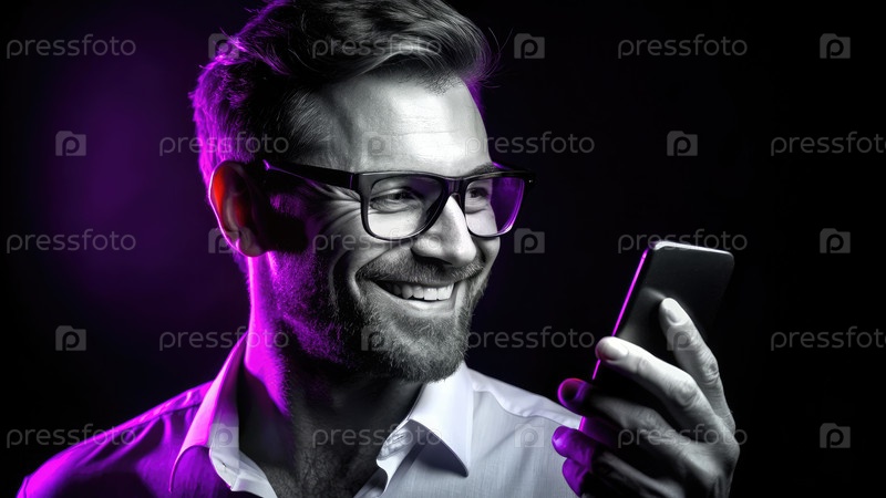 Улыбающийся мужчина в очках использует смартфон с фиолетовым освещением