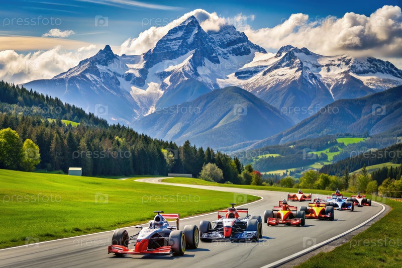 Формула-1 гоночные автомобили Speed Through Mountain Pass в солнечный день