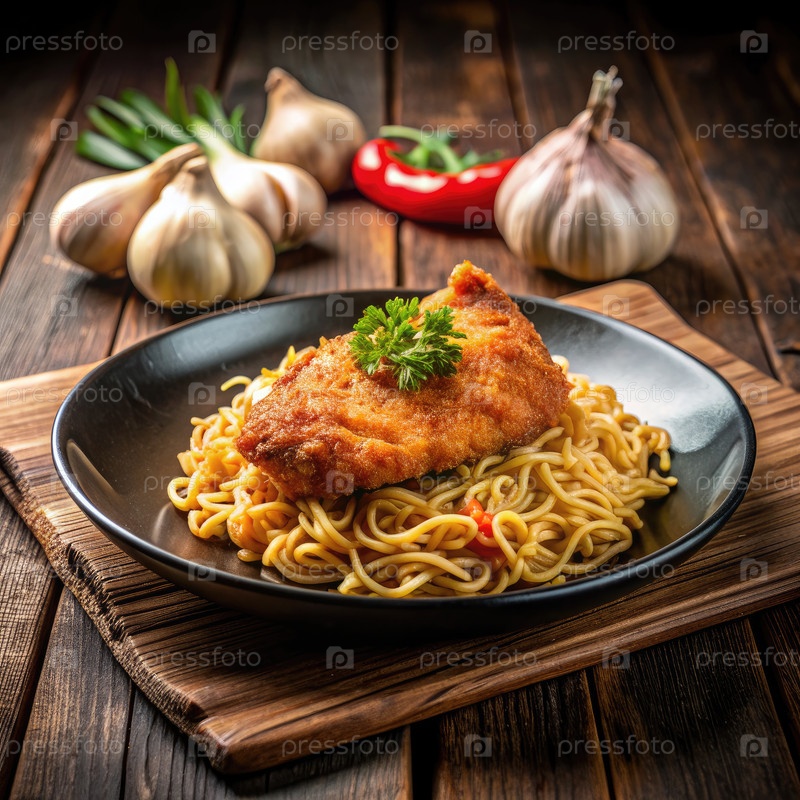 Хрустящая курица и лапши, подаваемые на черной тарелке