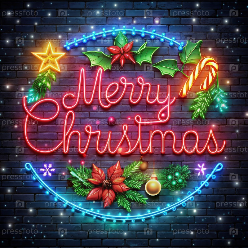 Яркий неоновый рождественский знак украшает кирпичную стену