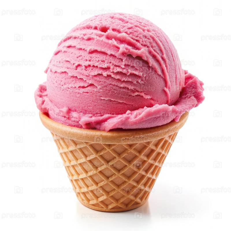 Одна ложка розового мороженого в конусе вафли на белом фоне