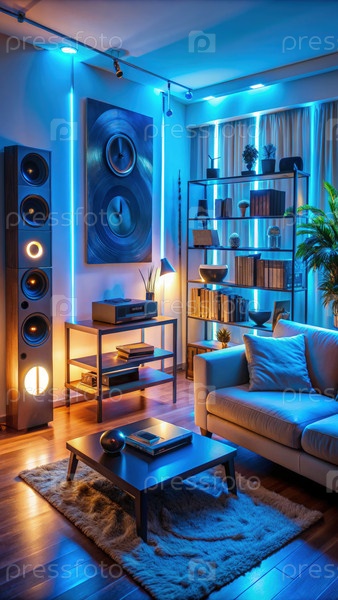 Гостиная с окружающим синим освещением и уютной мебелью. генеративный современный ИИ