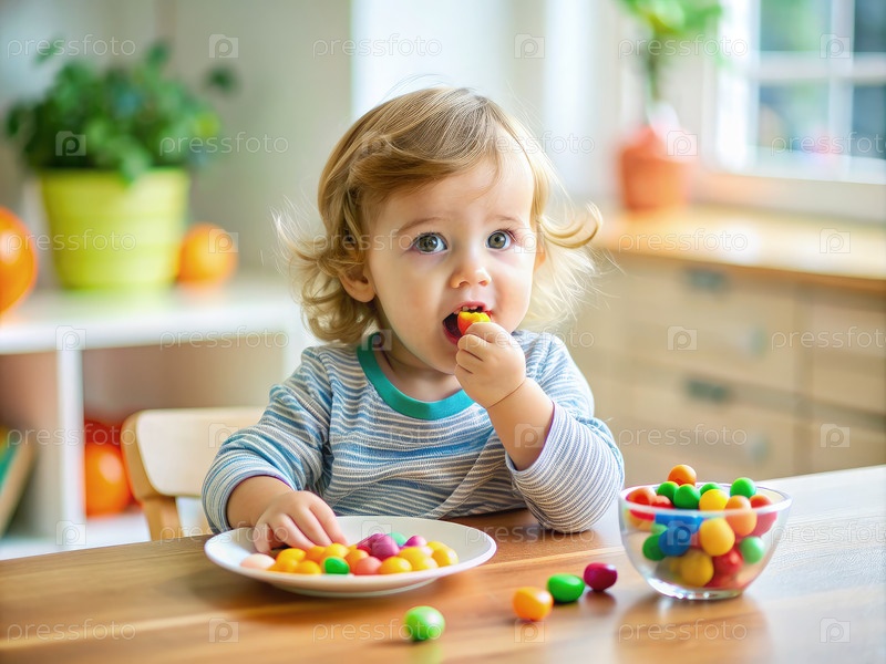 Малыш-мальчик наслаждается красочными конфетами в кухонной обстановке