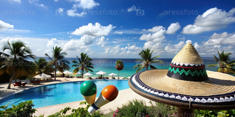 Sombrero с видом на тропический бассейн и пляж в Мексике