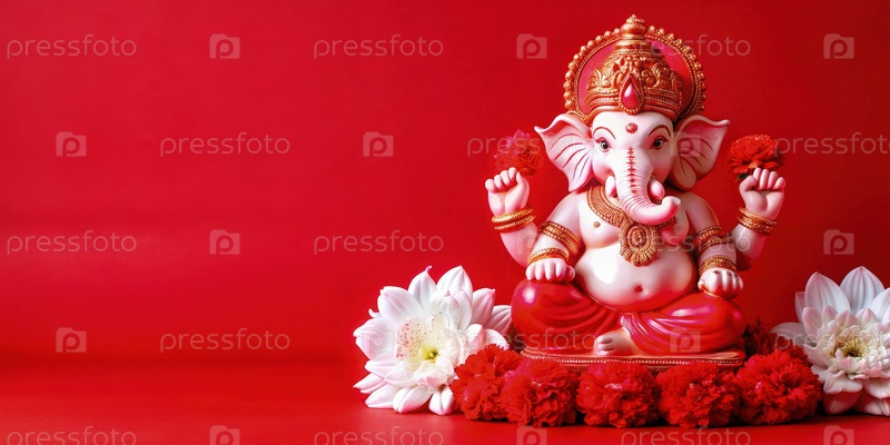 Статуя Белого Ганеша с красными цветами на красном фоне