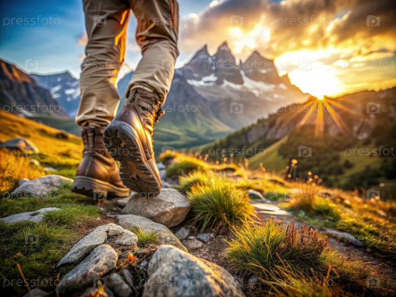 Нога пешехода, ступающая по Скалистой тропе во время захода солнца в горах