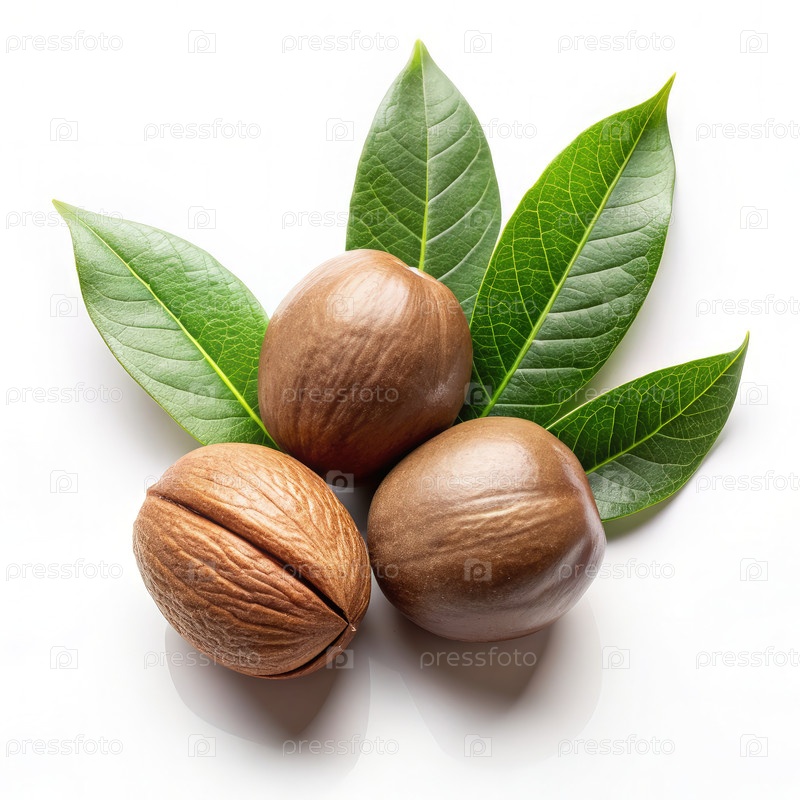 Ближайшее изображение двух орехов шии и зеленых листьев на белом фоне