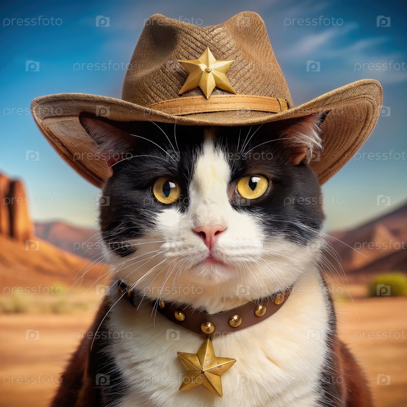 Черно-белый кот, носящий шерифскую шляпу и звезду в пустынном пейзаже