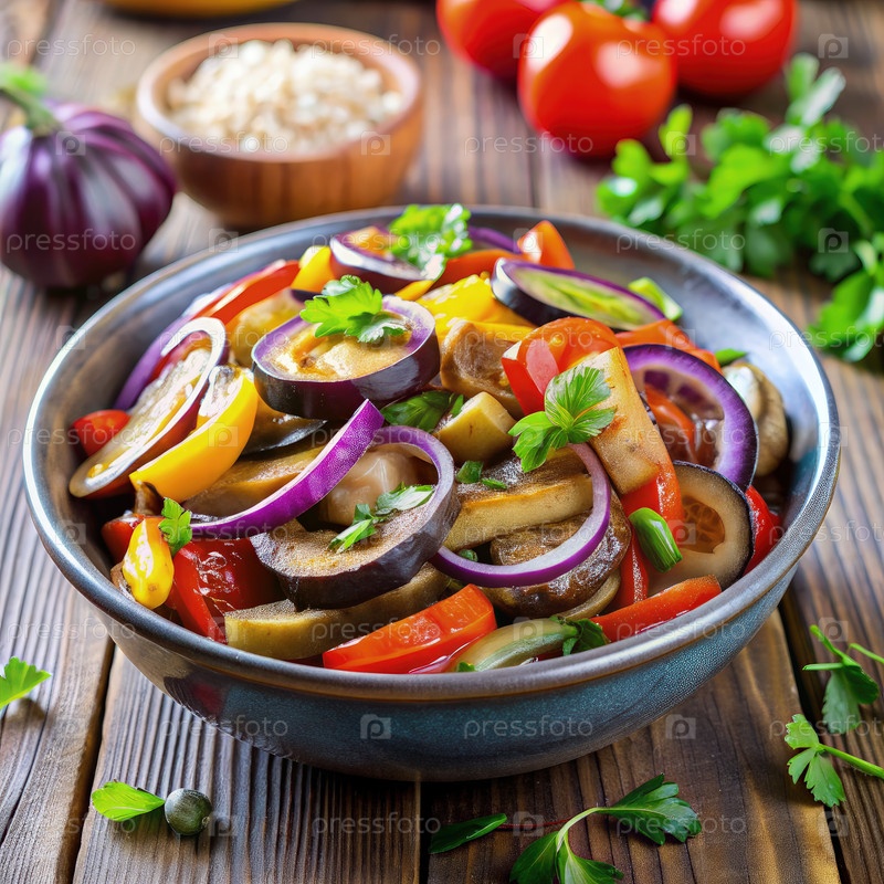 Маринованный салат из баклажанов и овощей в голубой миске на деревянном столе