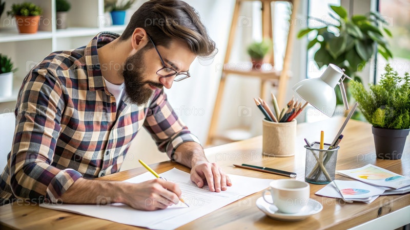 Графический дизайнер рисует на бумаге в домашней конторе