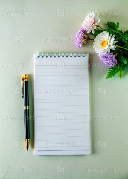 Пустой блокнот с ручкой и цветами на светло-зеленой поверхности