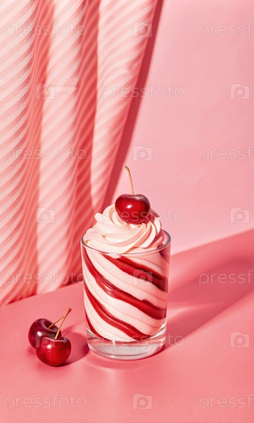 Вишневый сверху отбитый сливочный и конфеты тростниковые Swirl десерт в стакане. генеративный AI