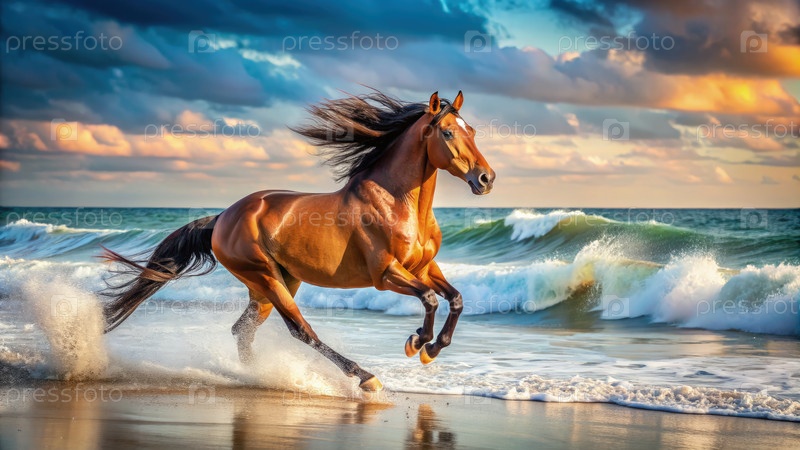 Величественный коричневый конь галопирует на песчаном пляже при закате солнца
