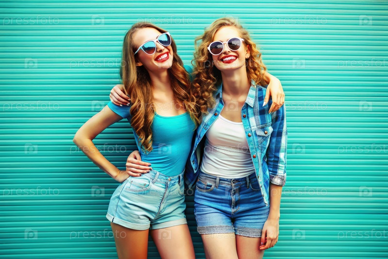 Две улыбающиеся женщины в солнцезащитных очках и обычных летних нарядах позируют против голубой стены