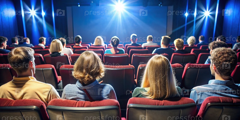 Задний вид зрителей, смотрящих фильм в темном кинотеатре