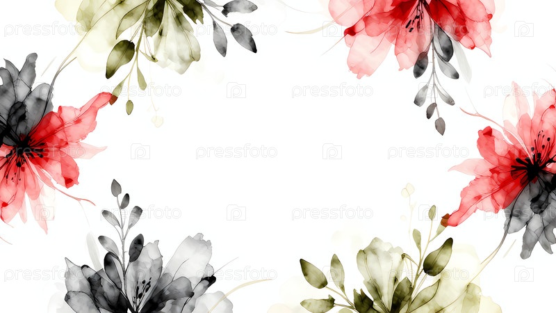 Ярко-красные, черные и бежевые цветы переплетаются с нежными листьями, создавая элегантную границу на спокойном белом холсте, празднуя мимолетное искусство природы в полном цветении Генеративный ИИ