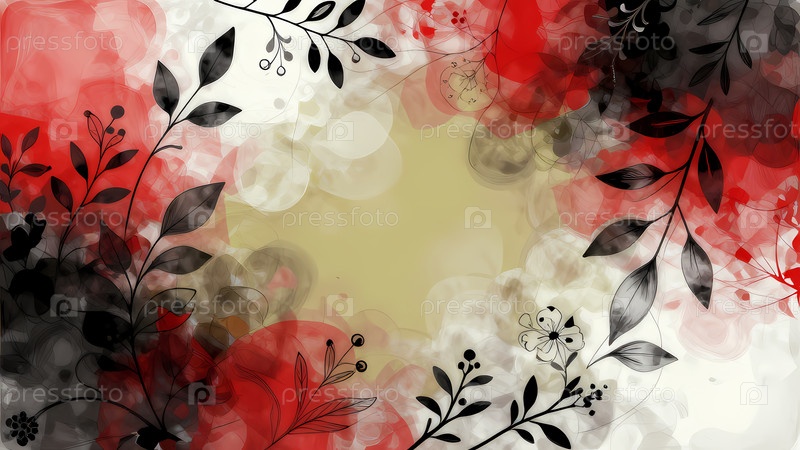 Красные и черные цвета элегантно переплетаются на мягком бежевом фоне, создавая завораживающую эфемерную сцену, заполненную нежными листьями и абстрактной красотой Generative AI