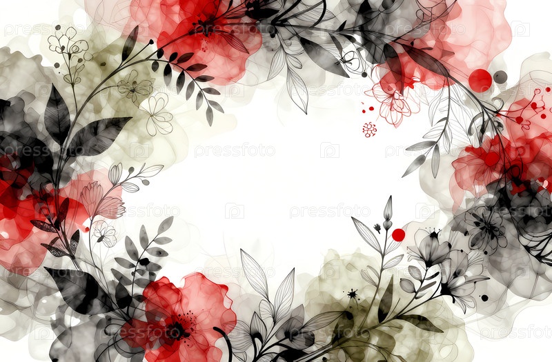 Нежные цветы в красных, черных и бежевых оттенках переплетаются с приглушенными листьями, создавая мечтательную рамку на спокойном белом фоне, провоцируя чувство мимолетной красоты Generative AI