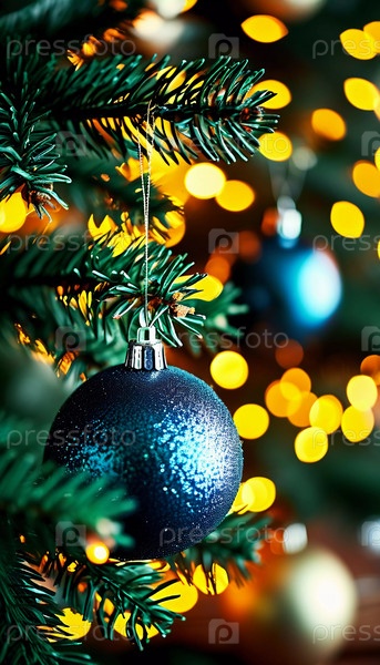 Красочные рождественские украшения украшают ветви пихты, яркие шары в оттенках синего, воплощающие праздничное настроение зимой